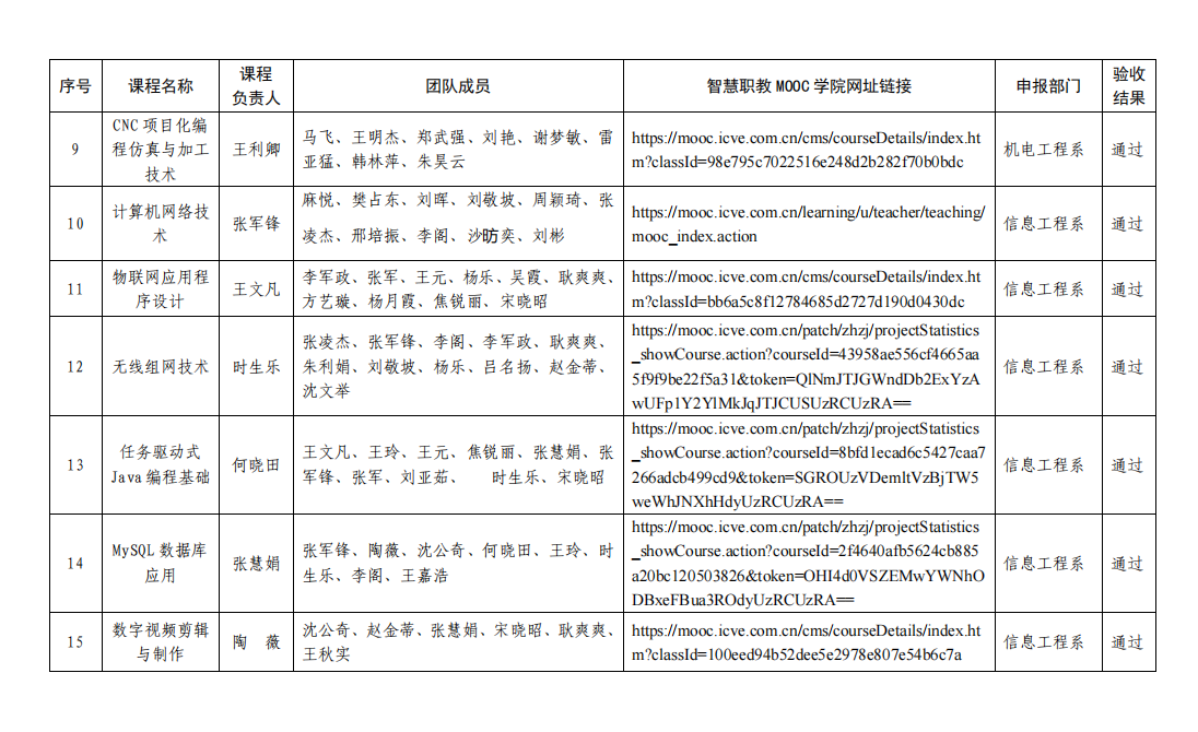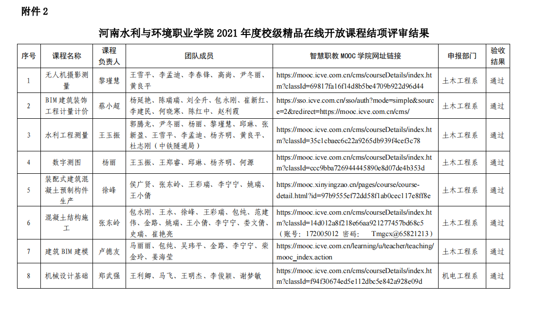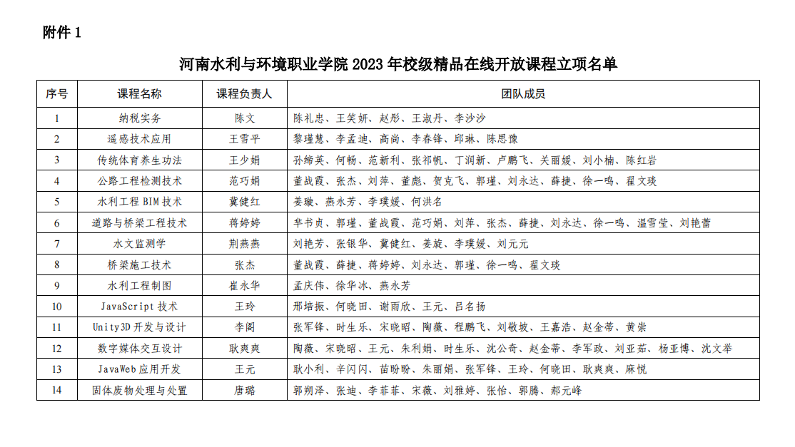 根据《河南水利与环境职业学院关于公布2021年校级精品在线开放课程立项名单的通知》(豫水职院〔2021〕173 号)《河南水利与环境职业学院精品在线开放课程建设与管理办法》(豫水职院〔2023〕32号)等文件精神,经个人申报,系部推荐,教务处初审,专家评审等环节,《纳税实务》等14门课程立项2023年校级“精品在线开放课程”建设项目,详情见附件1。《无人机摄影测量》等23门课程通过验收结项评审,详情见附件2,现予以公示。