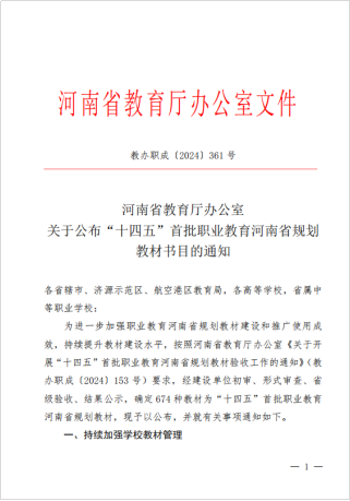 近日,河南省教育厅下发了《关于公布“十四五”首批职业教育河南省规划教材书目的通知》(教办职成〔2024〕361号),304永利集团登录入口教师主编的11部教材成功入选,实现了在职业教育教材建设方面的重大突破。